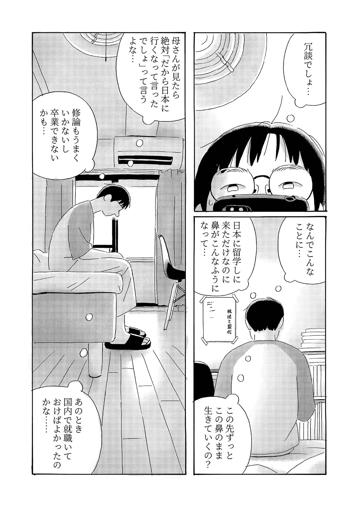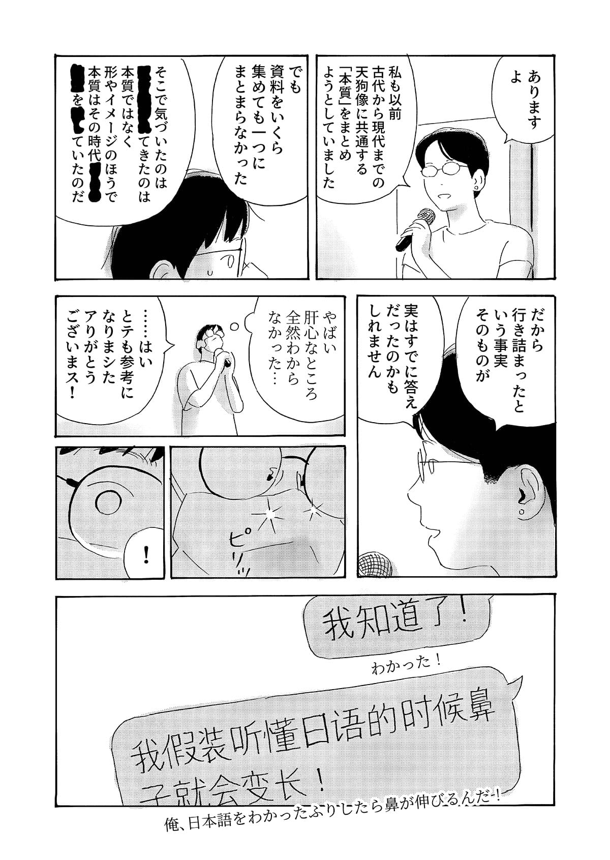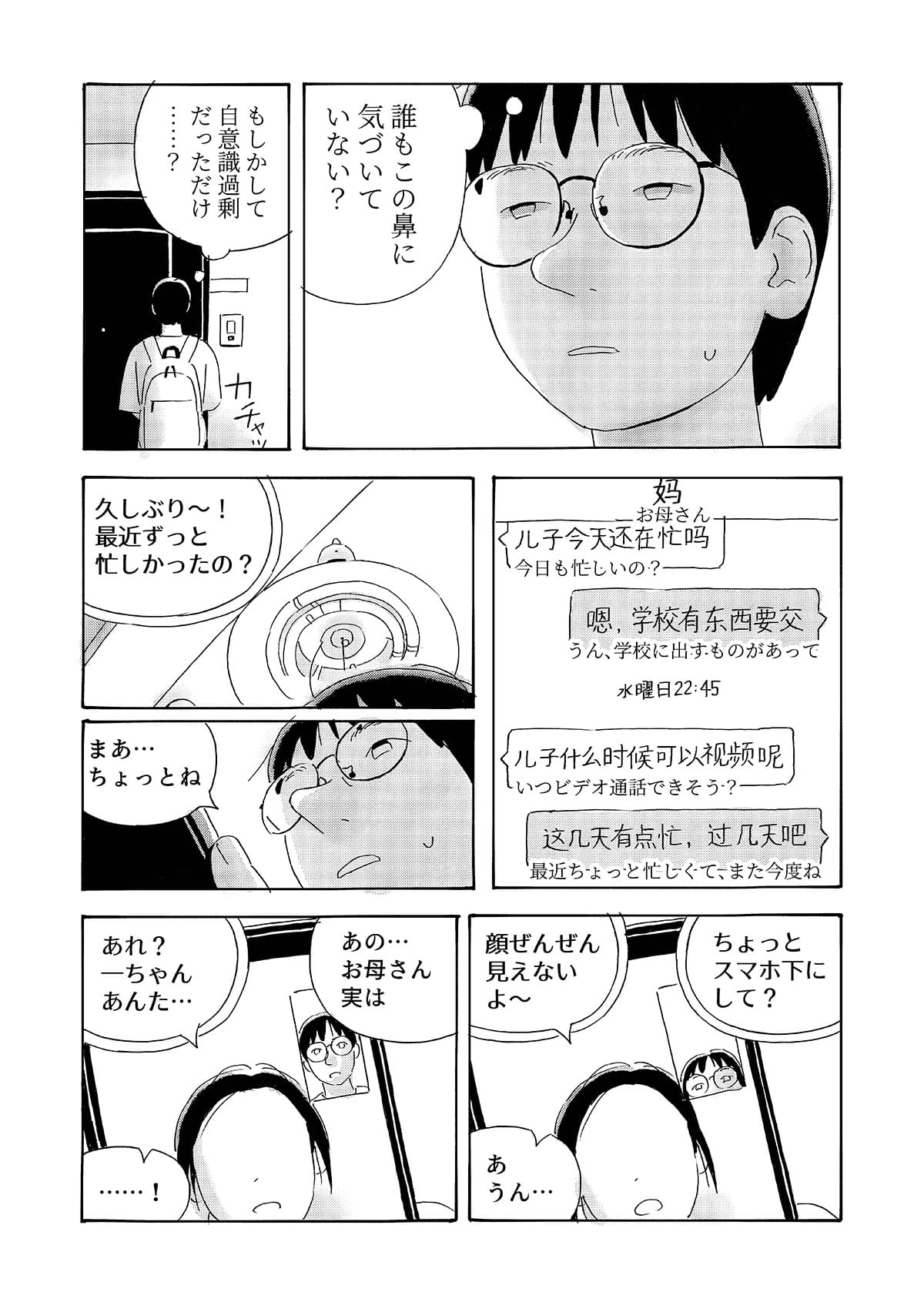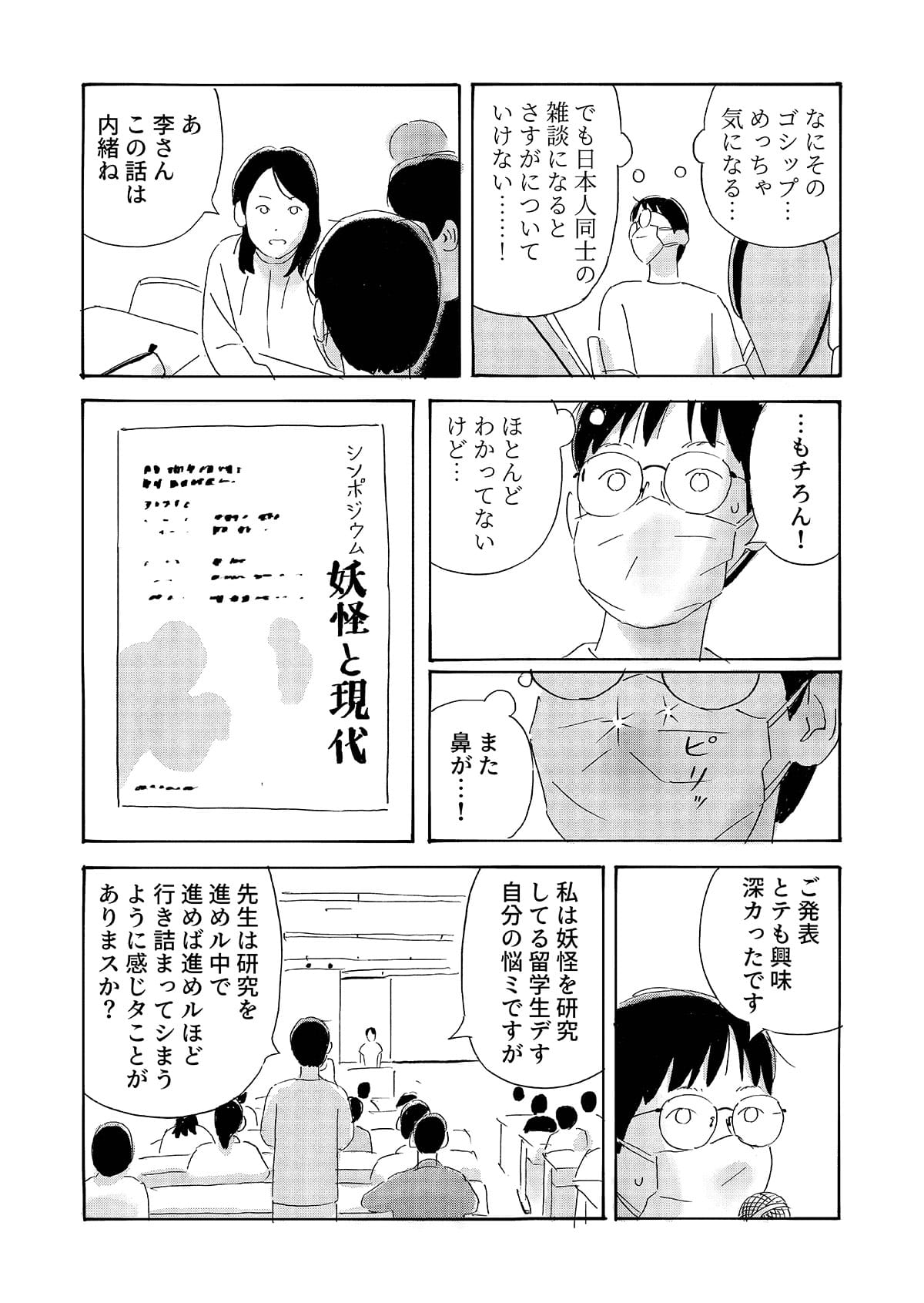 本作は、京都で生活する中国人留学生の視点から、第二言語を使って異文化の中で生きる際に生じる戸惑いや葛藤を描いた漫画作品です。 日常の中で感じられるものの、言葉にしにくい違和感や感情を、シュールな表現として可視化することを試みています。 現実の風景とシュールな表現が重なり合うことで、個人的な体験や内面的な感覚が、読者と共有可能な物語として立ち上がることを目指しました。