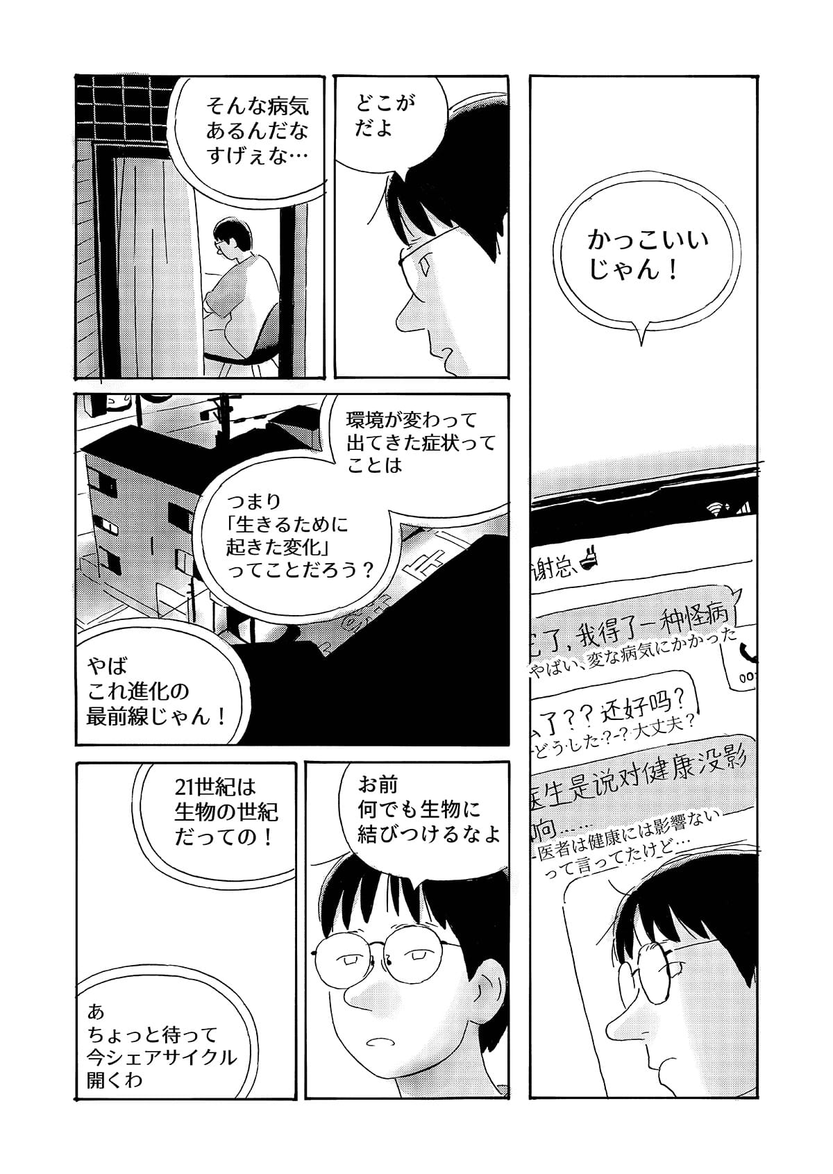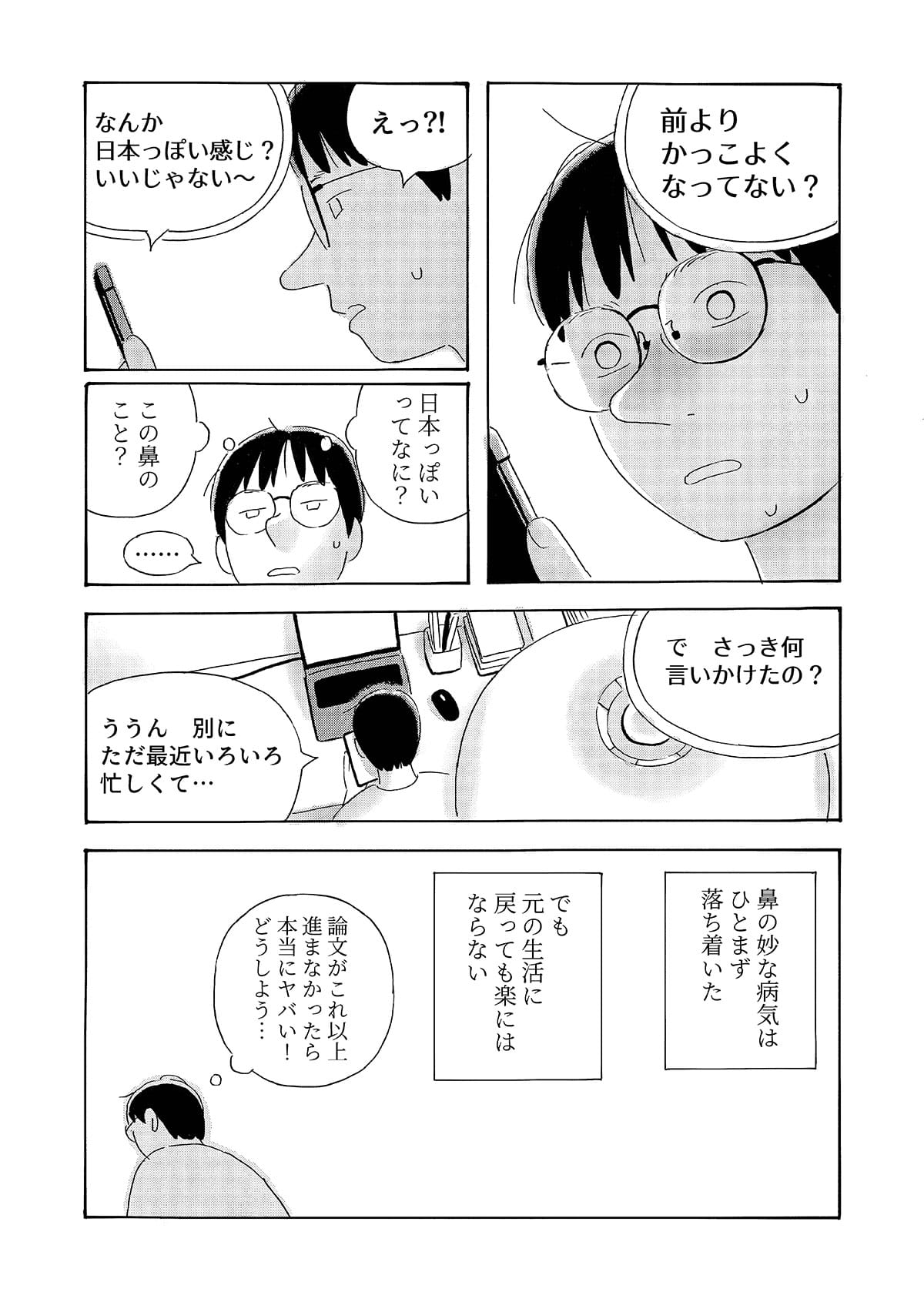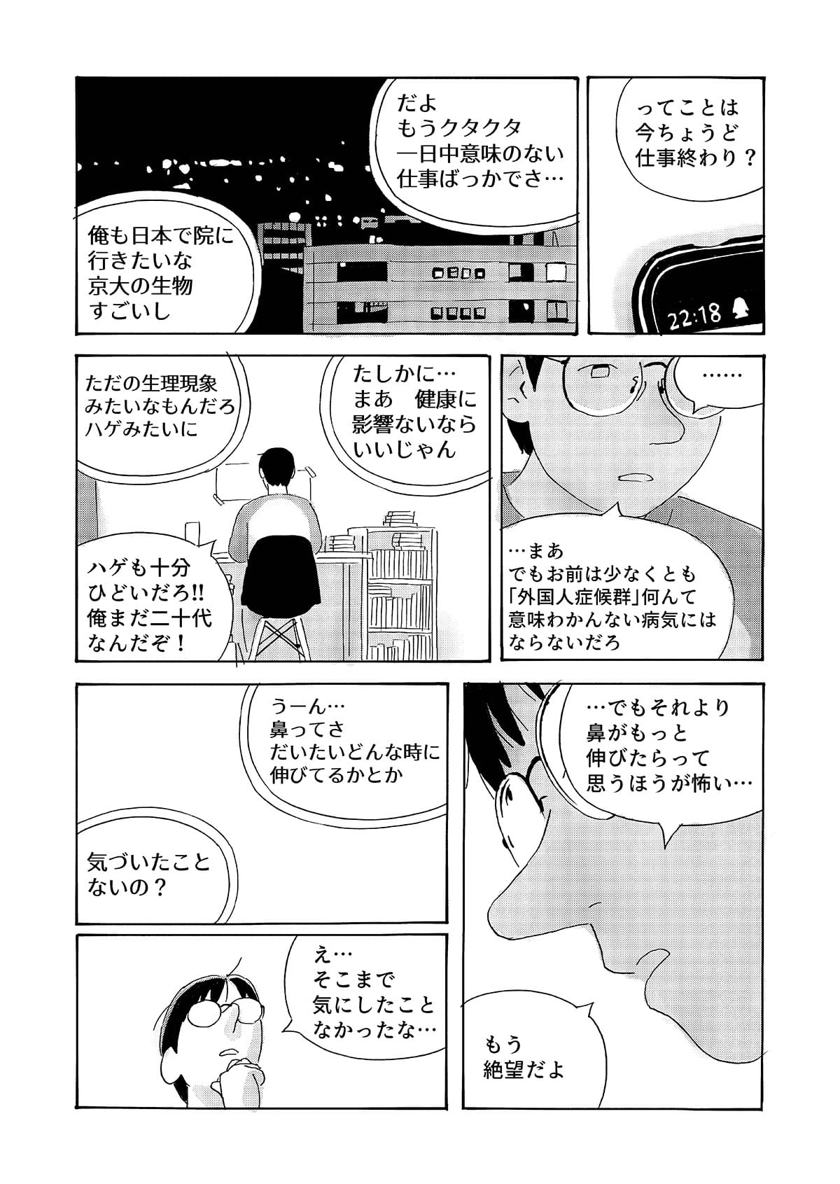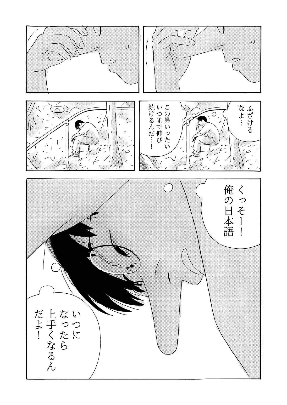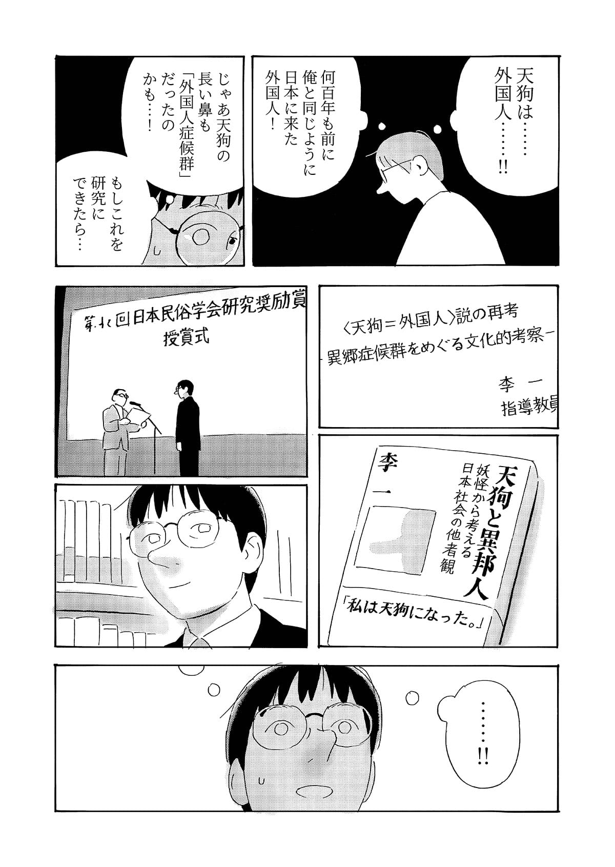 本作は、京都で生活する中国人留学生の視点から、第二言語を使って異文化の中で生きる際に生じる戸惑いや葛藤を描いた漫画作品です。 日常の中で感じられるものの、言葉にしにくい違和感や感情を、シュールな表現として可視化することを試みています。 現実の風景とシュールな表現が重なり合うことで、個人的な体験や内面的な感覚が、読者と共有可能な物語として立ち上がることを目指しました。