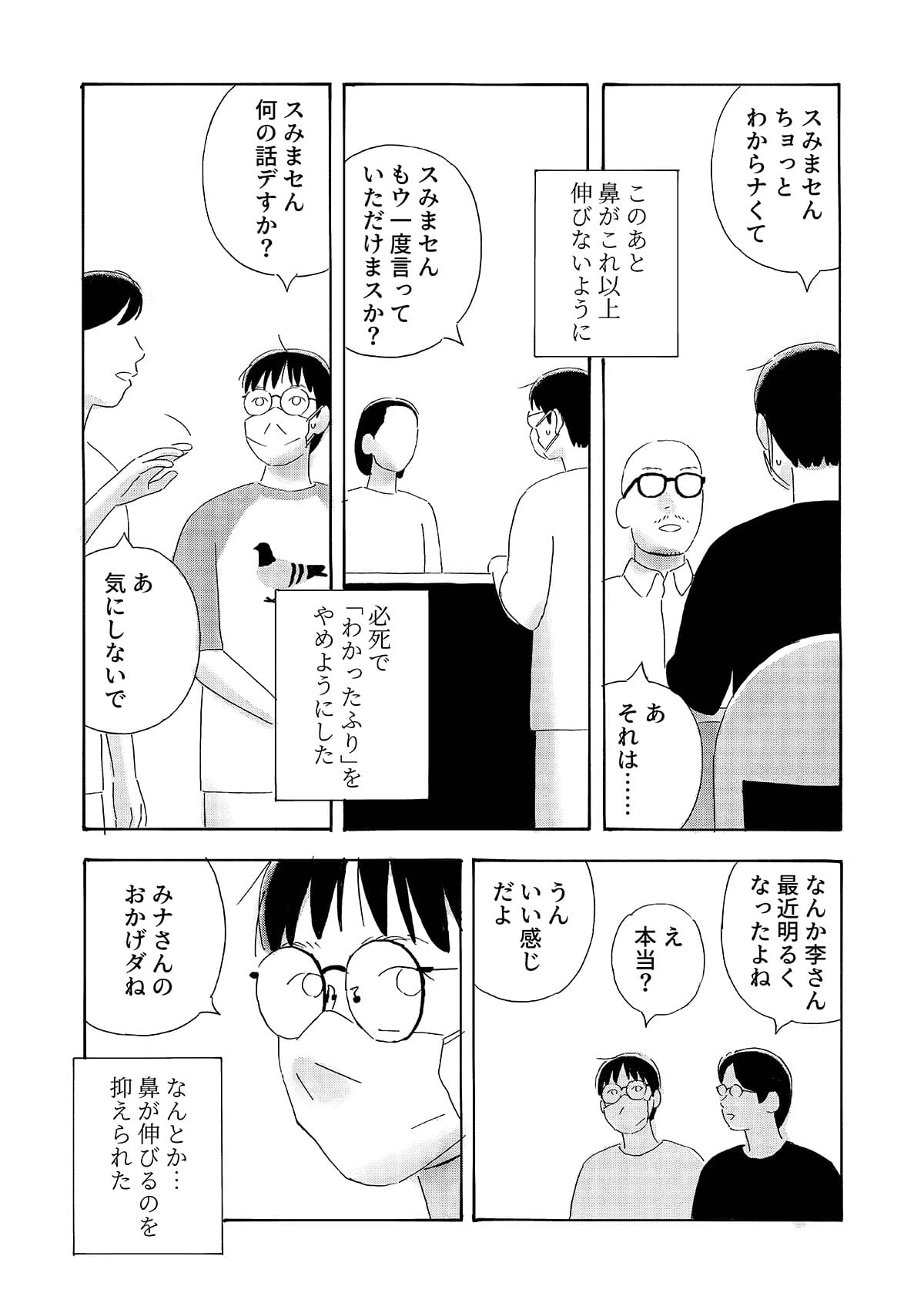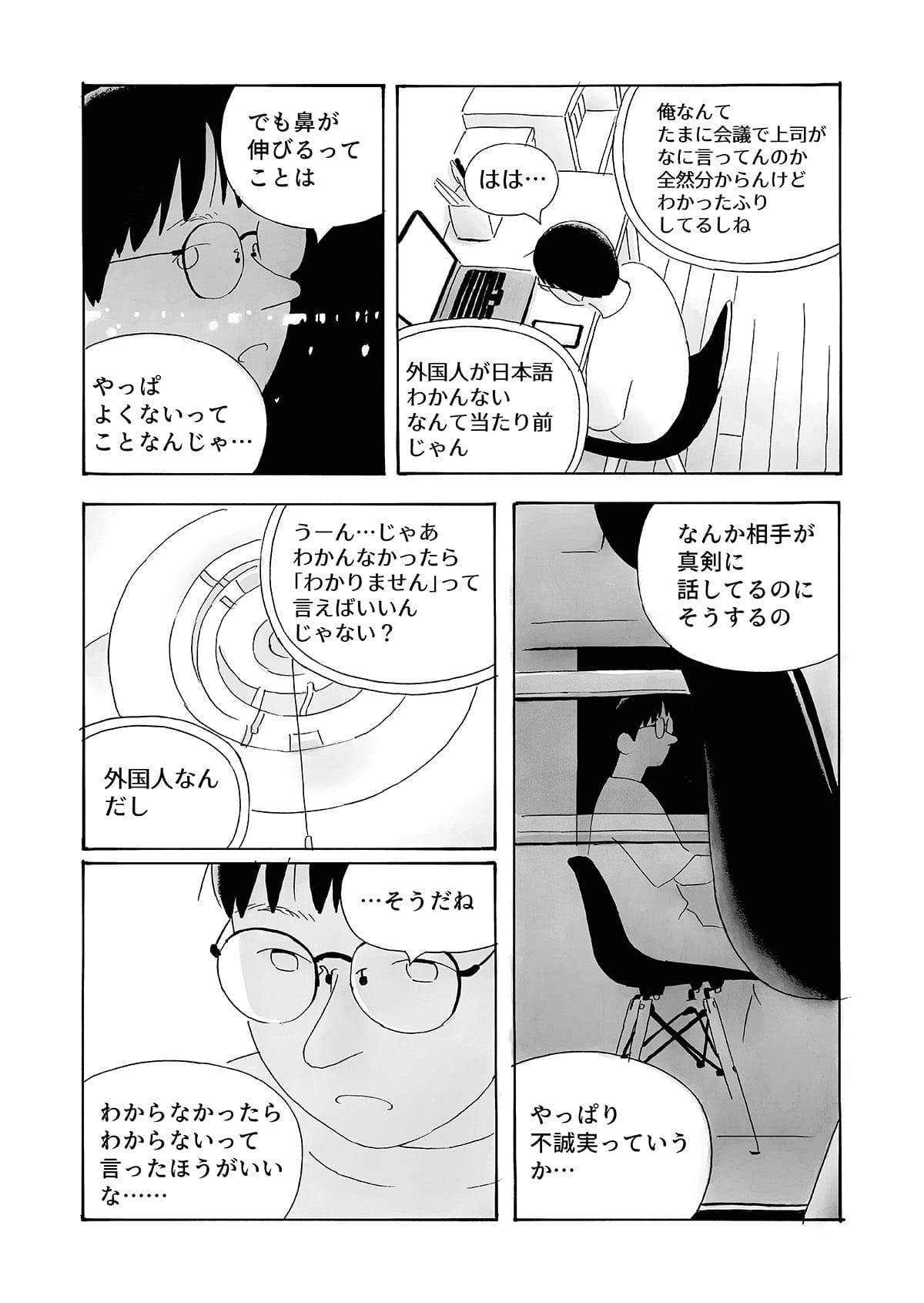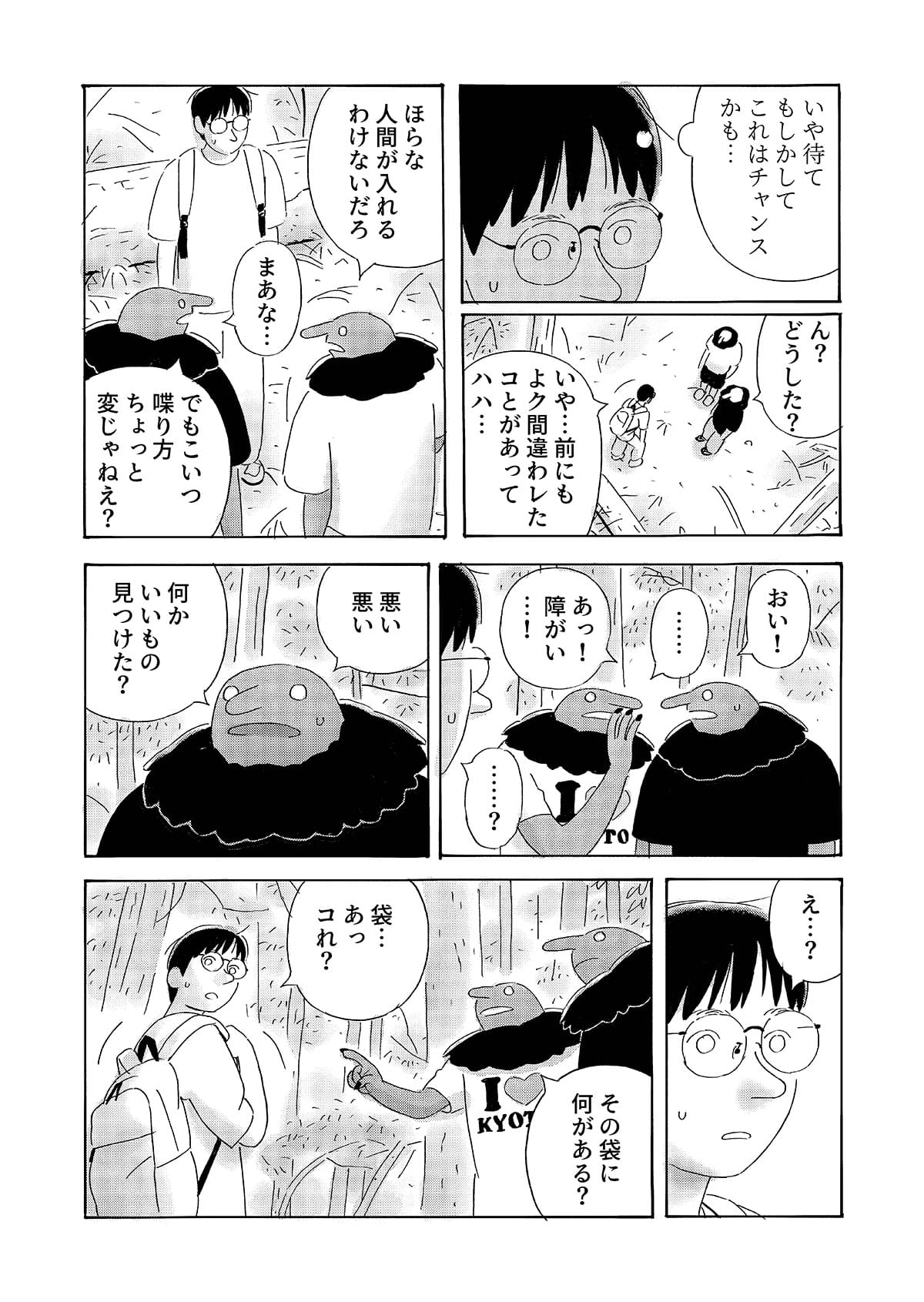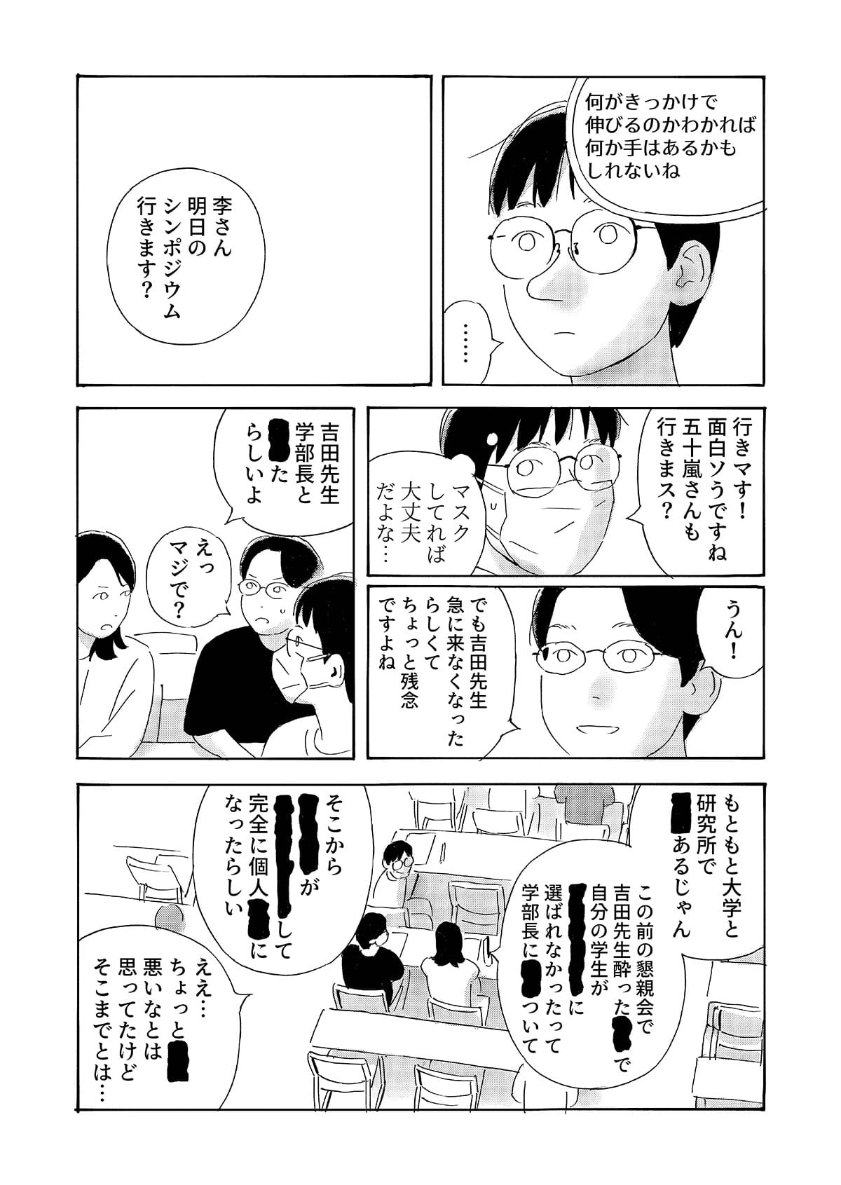 本作は、京都で生活する中国人留学生の視点から、第二言語を使って異文化の中で生きる際に生じる戸惑いや葛藤を描いた漫画作品です。 日常の中で感じられるものの、言葉にしにくい違和感や感情を、シュールな表現として可視化することを試みています。 現実の風景とシュールな表現が重なり合うことで、個人的な体験や内面的な感覚が、読者と共有可能な物語として立ち上がることを目指しました。